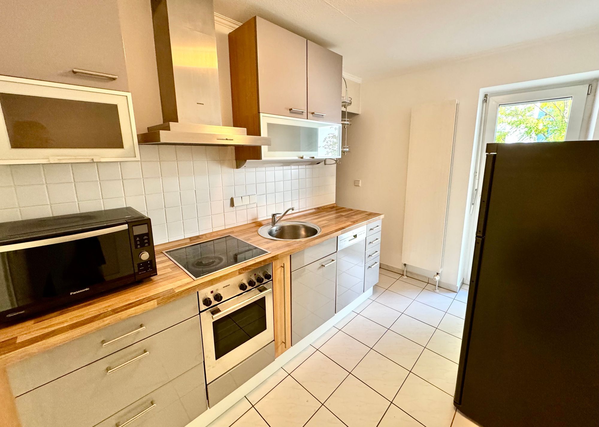 Die Küche ist mit einer Einbauküche ausgestattet, in einer kleinen Nische hinter der Küche kann man Waschmaschine und Trockner anschließen.