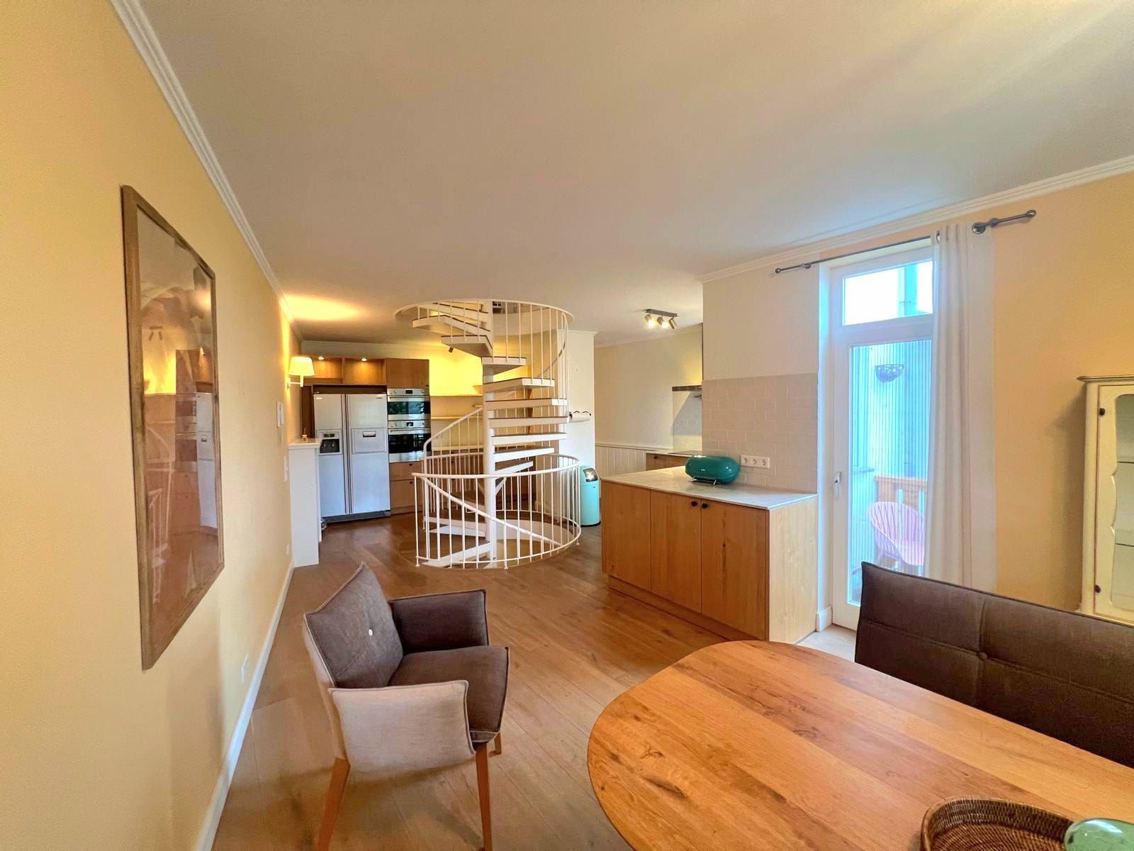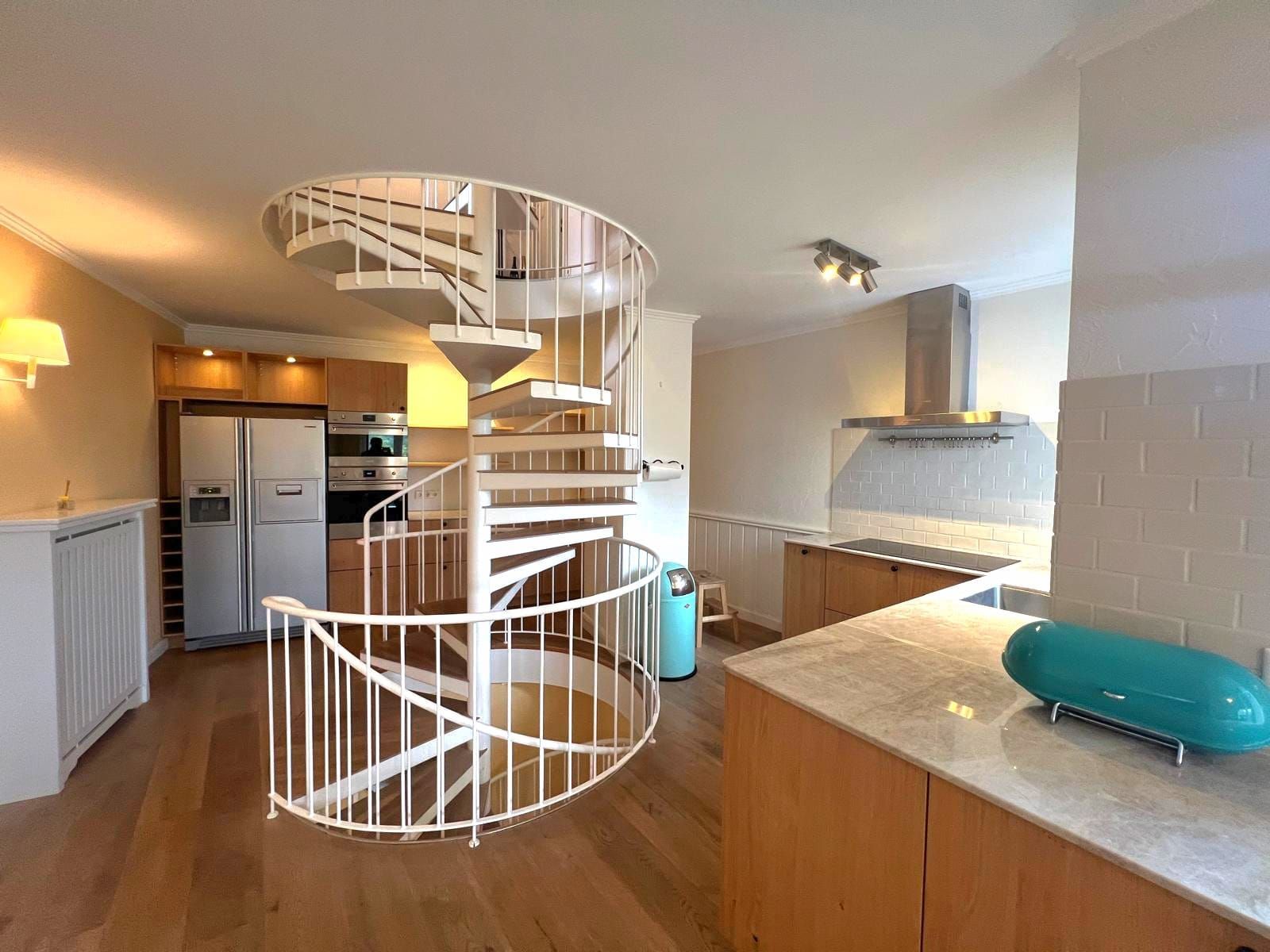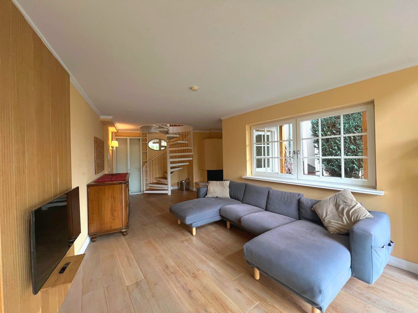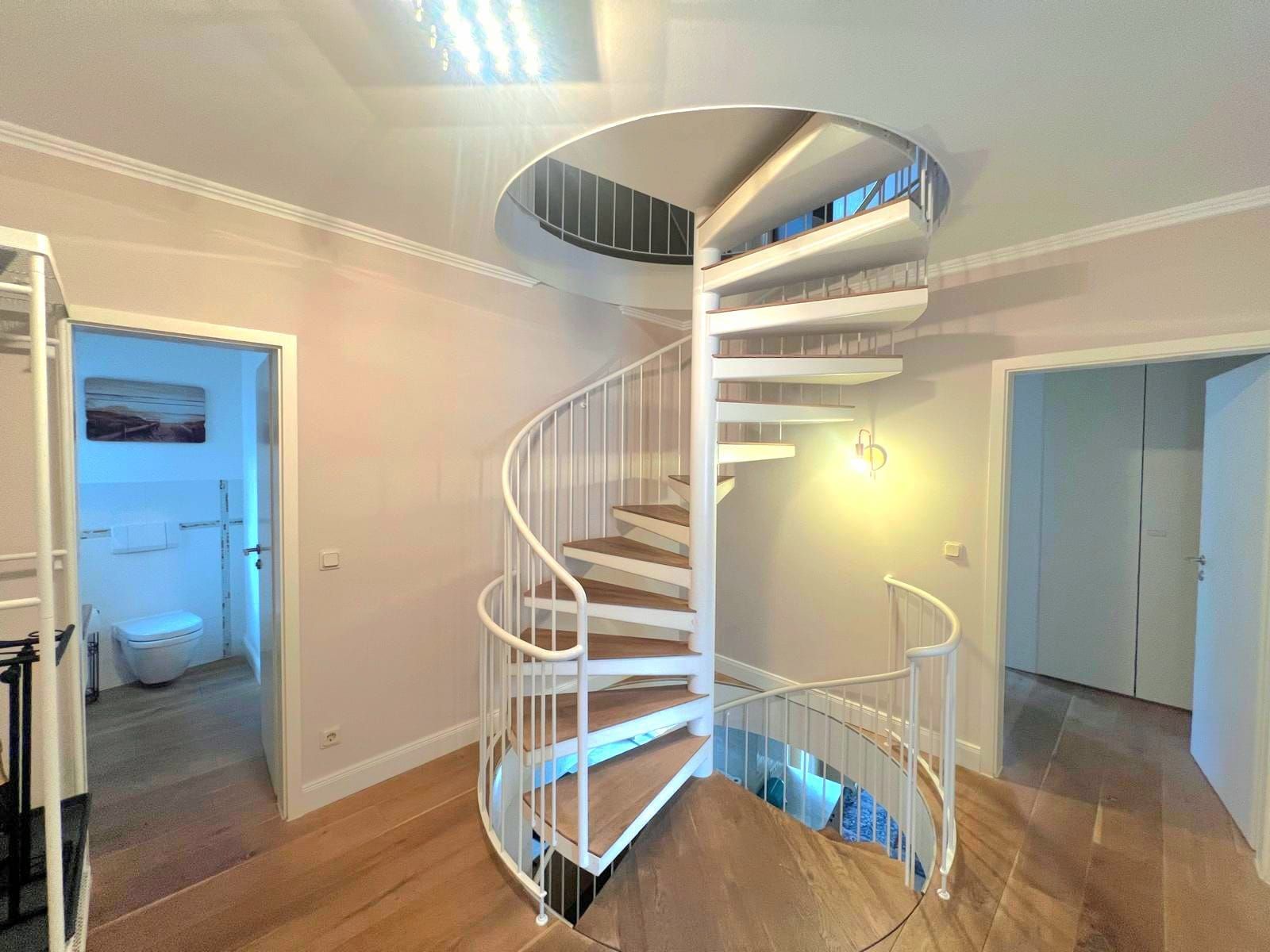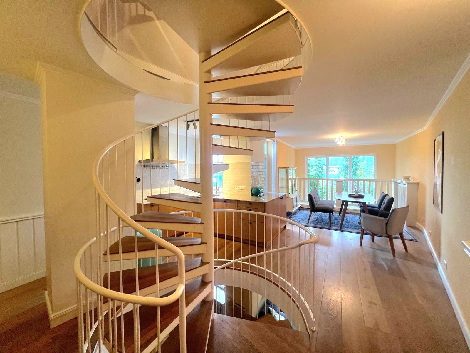 Dieses Haus besticht durch einen außergewöhnlich klugen Grundriss, der besonders Familien ein hohes Maß an Lebensqualität bietet. Eine elegante Wendeltreppe verbindet die Ebenen auf stilvolle Weise und sorgt zugleich für eine architektonisch reizvolle Raumwirkung. Sie schafft harmonische Rückzugsorte und offene Bereiche. Weiterhin überzeugt das Reihenhaus durch seine moderne Ausstattung, die sich besonders in der Einbauküche und dem Badezimmer widerspiegelt.