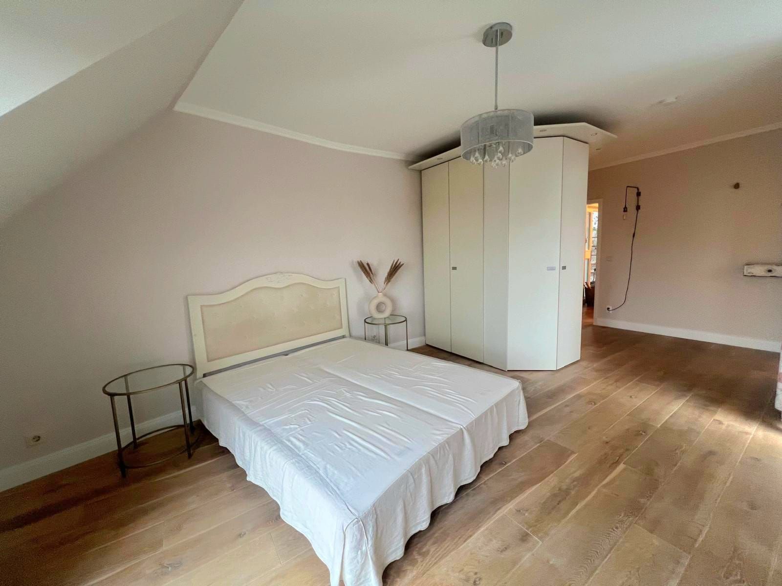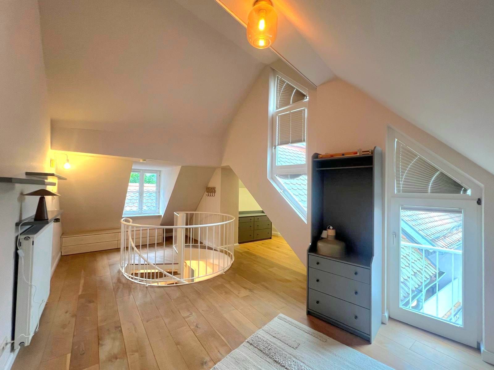 Das Dachgeschoss wurde zu einem modernen Studiozimmer ausgebaut, welches durch seinen Schnitt eine besonders spannende Raumwirkung erhält.