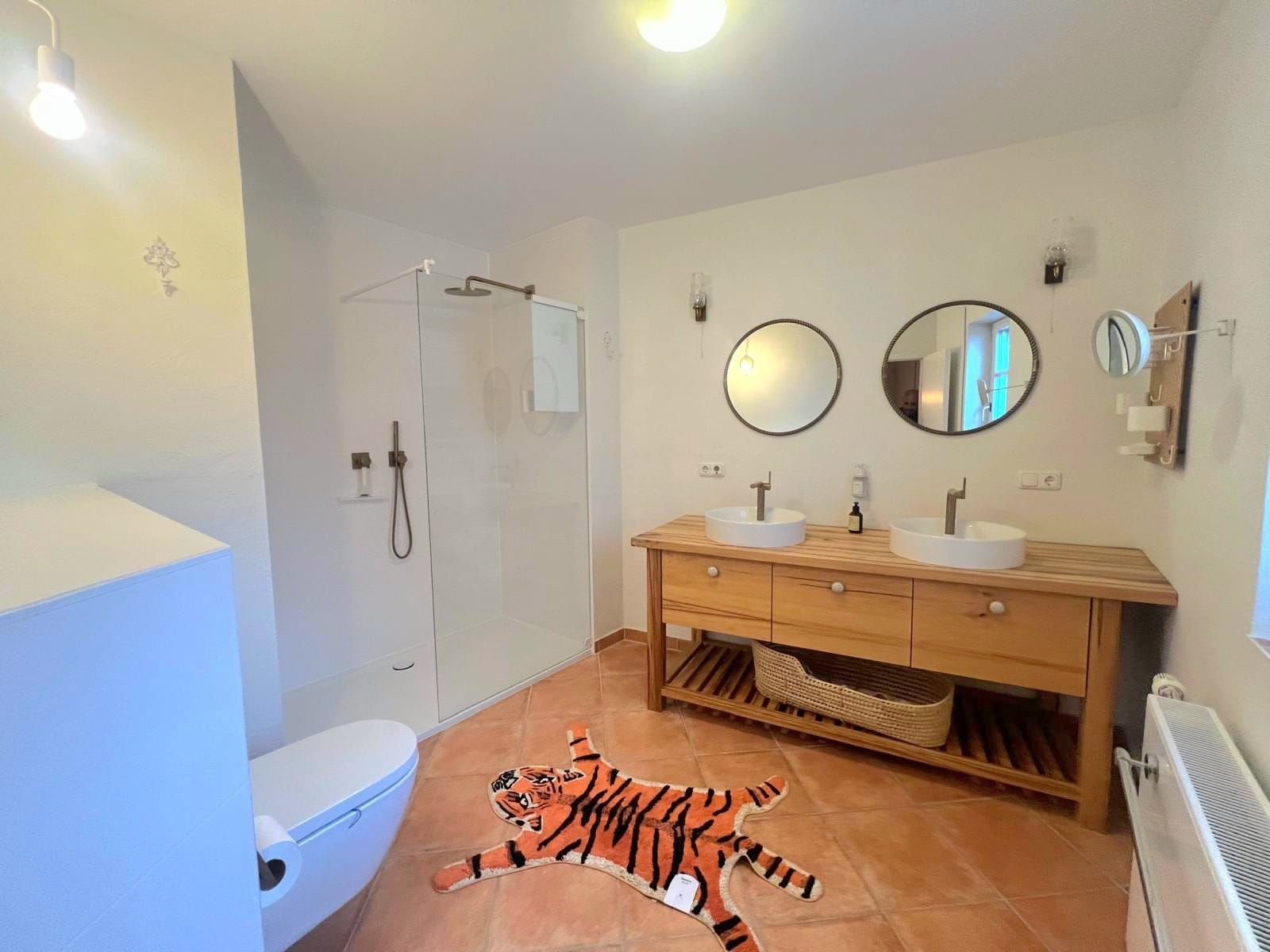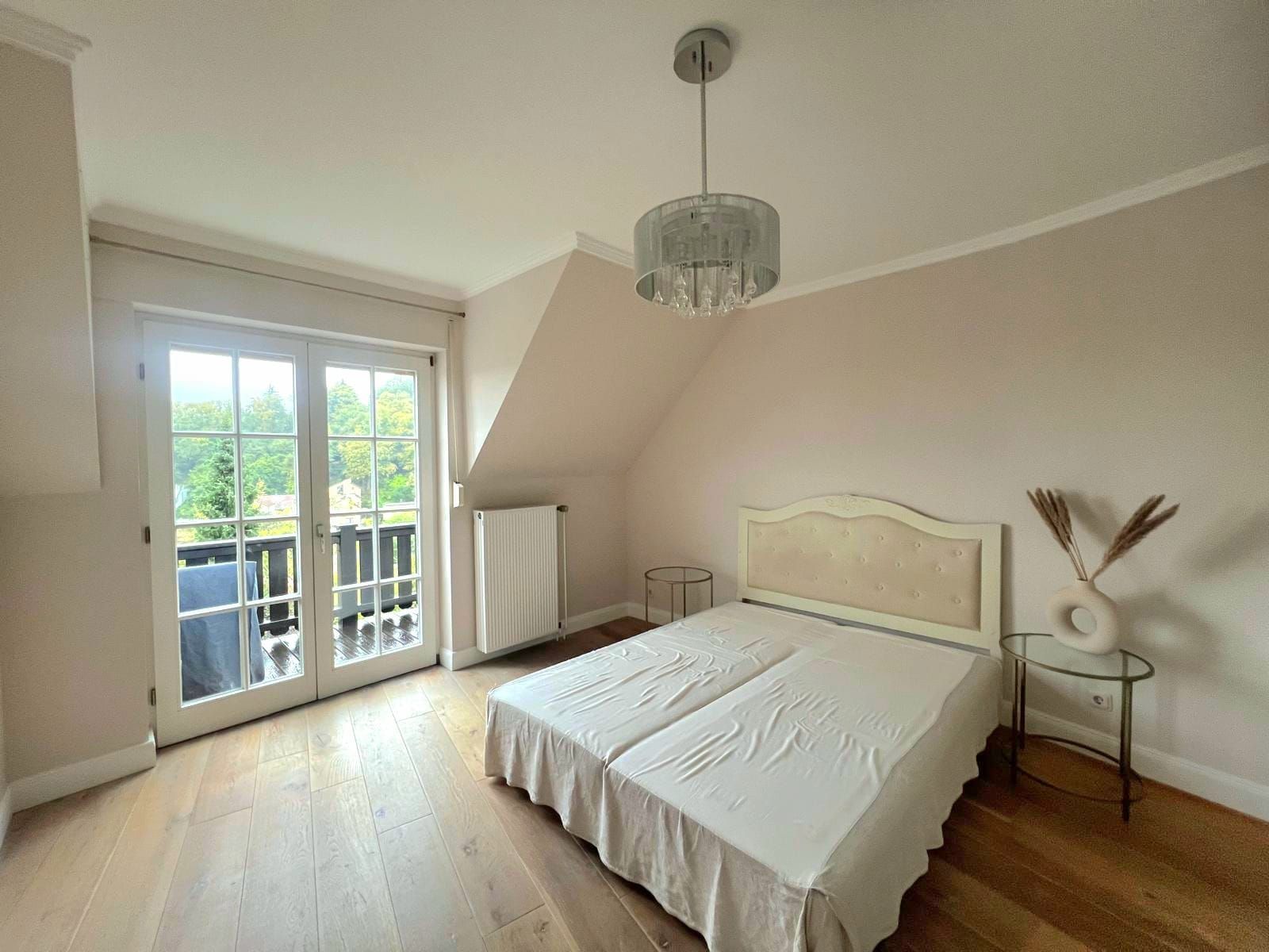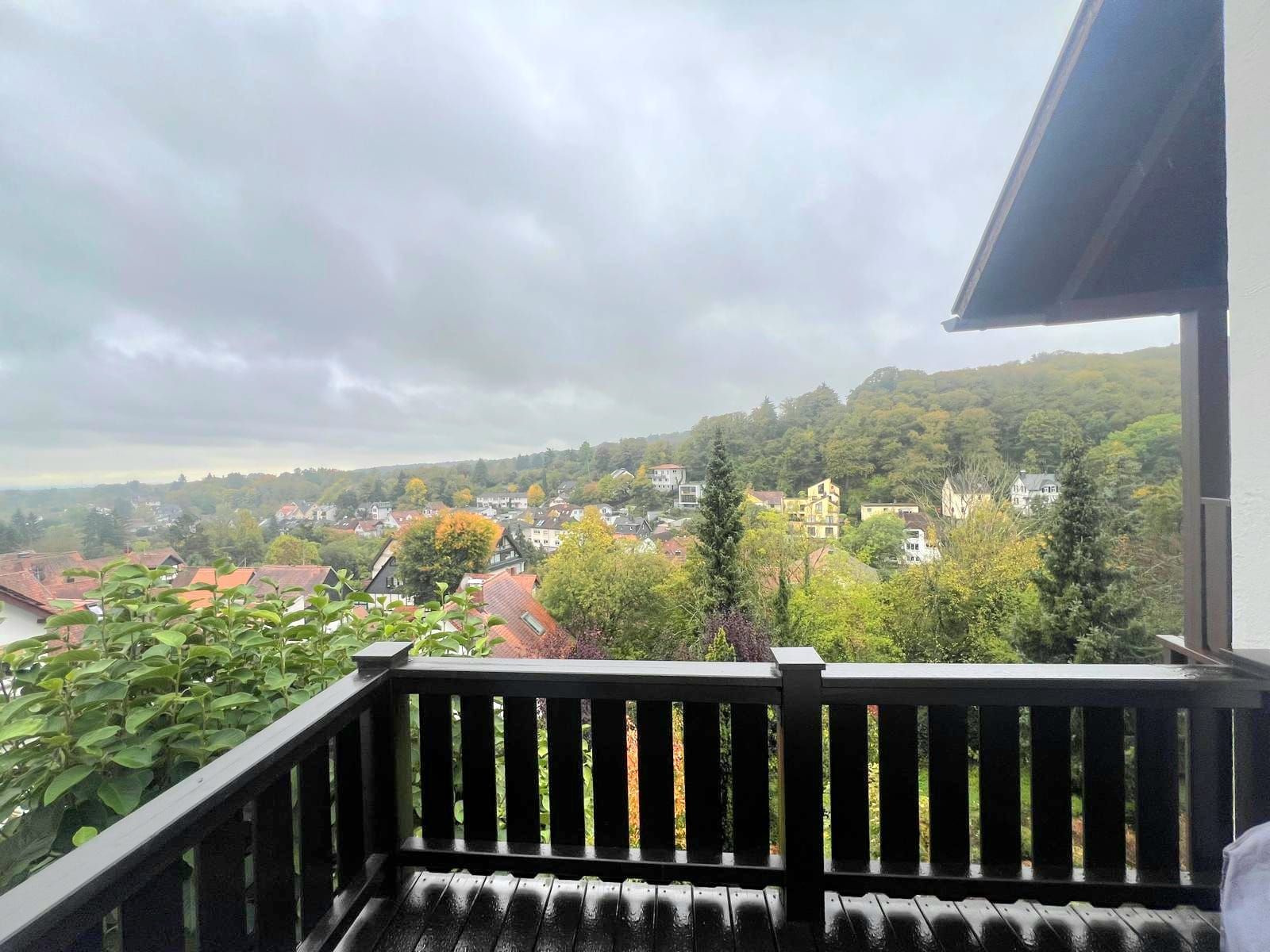 Das Hauptschlafzimmer verfügt über einen privaten Balkon und auch über den Essbereich im Erdgeschoss lässt sich ein weiterer Balkon betreten, der zum Frühstücken im Freien einlädt und über eine Treppe direkt in den Garten führt. Der Essbereich besticht darüber hinaus mit seiner Galerie sowie einer vollständig doppelverglasten Fensterfront, die hier den direkten Blick in den Taunus bietet und sich im Stockwerk darunter direkt auf die Terrasse öffnet.