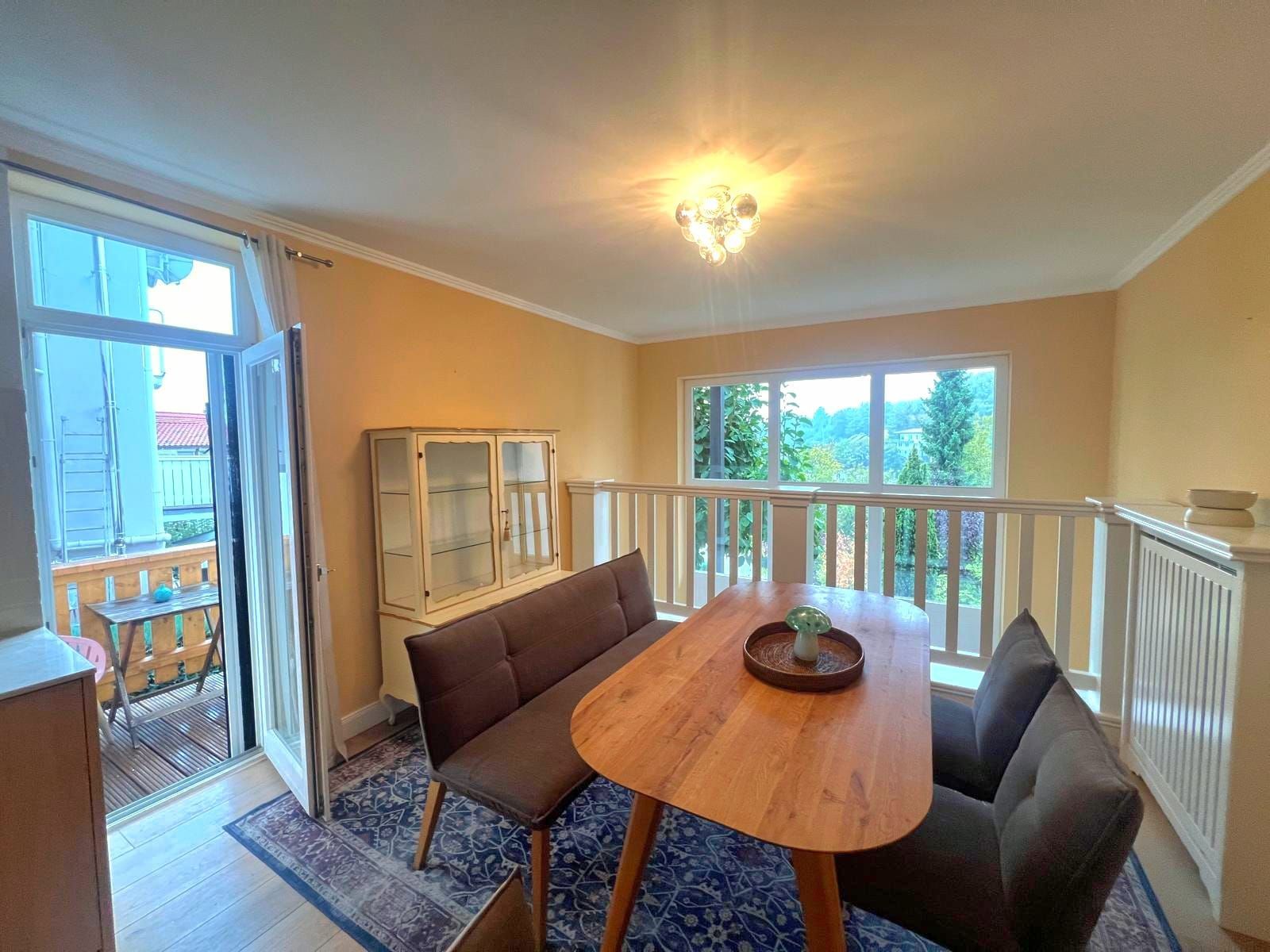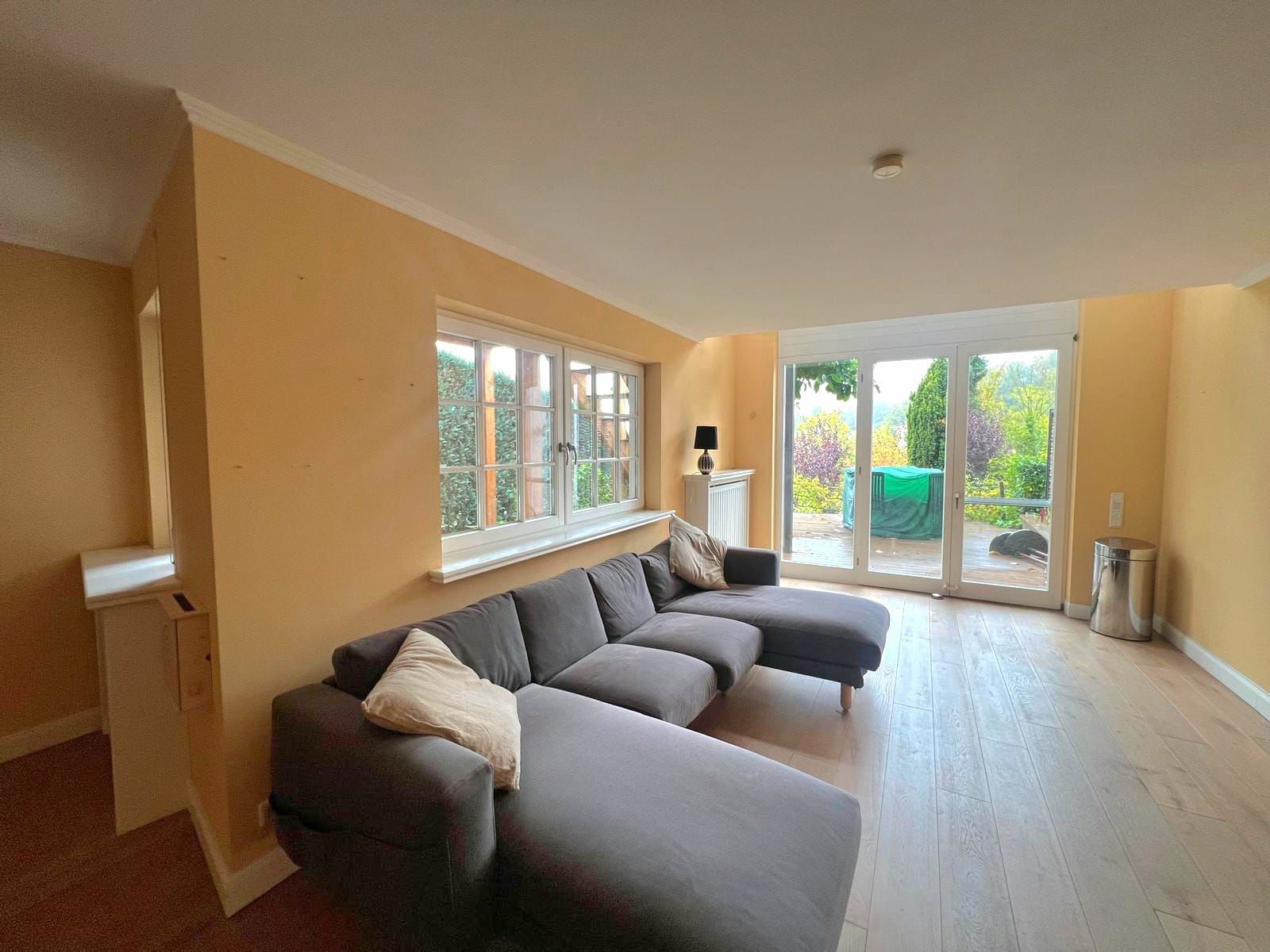 Der weitläufige Wohnbereich öffnet sich zur großzügigen Terrasse, die mit einem traumhaften Blick ins Grüne zum Verweilen einlädt. Von hier aus führt der Weg direkt in den gepflegten Garten. Die gelungene Verbindung von Wohnkomfort und Natur macht diesen Teil des Hauses zum echten Mittelpunkt des Alltags.