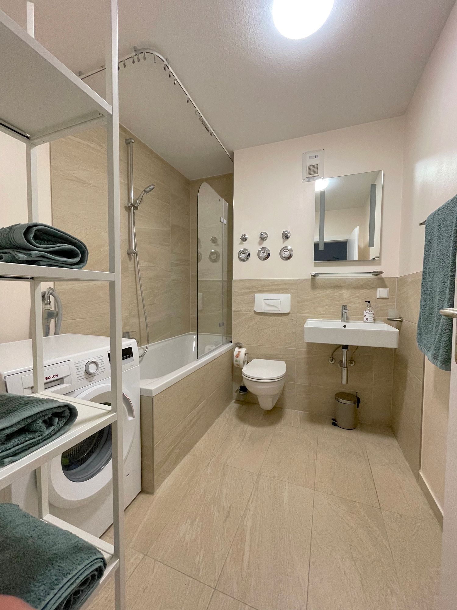 | innenliegendes Badezimmer mit Waschmaschine | |