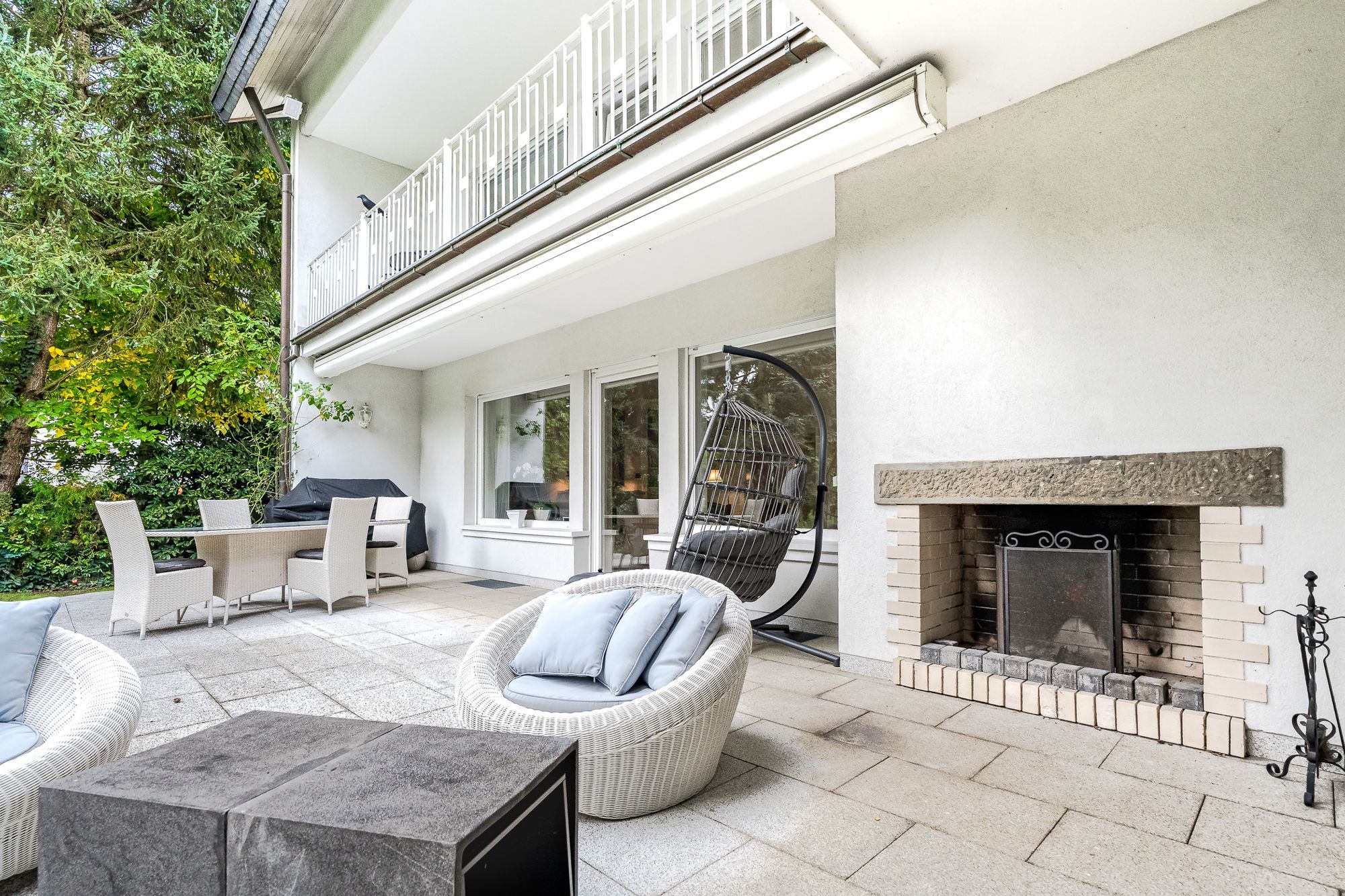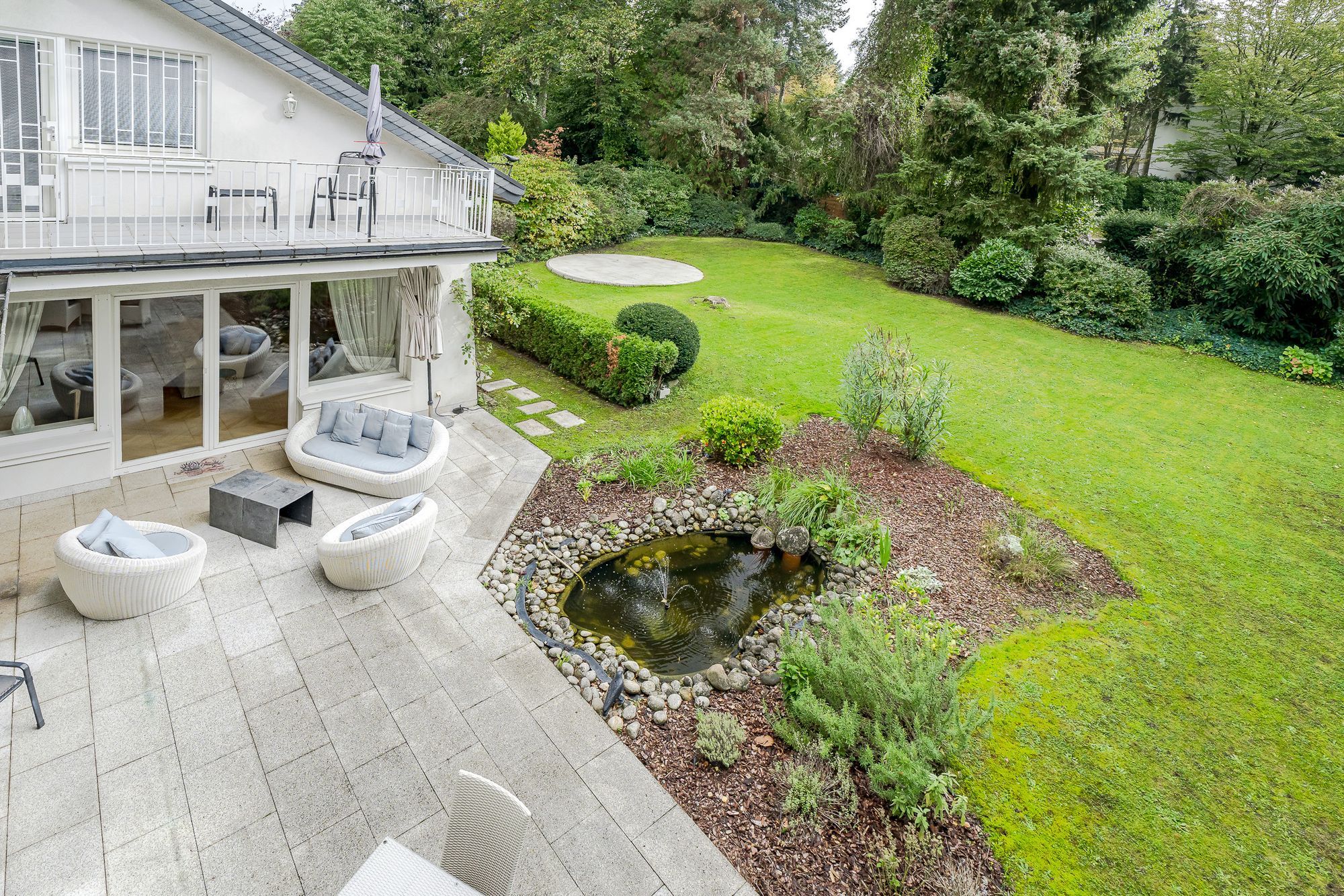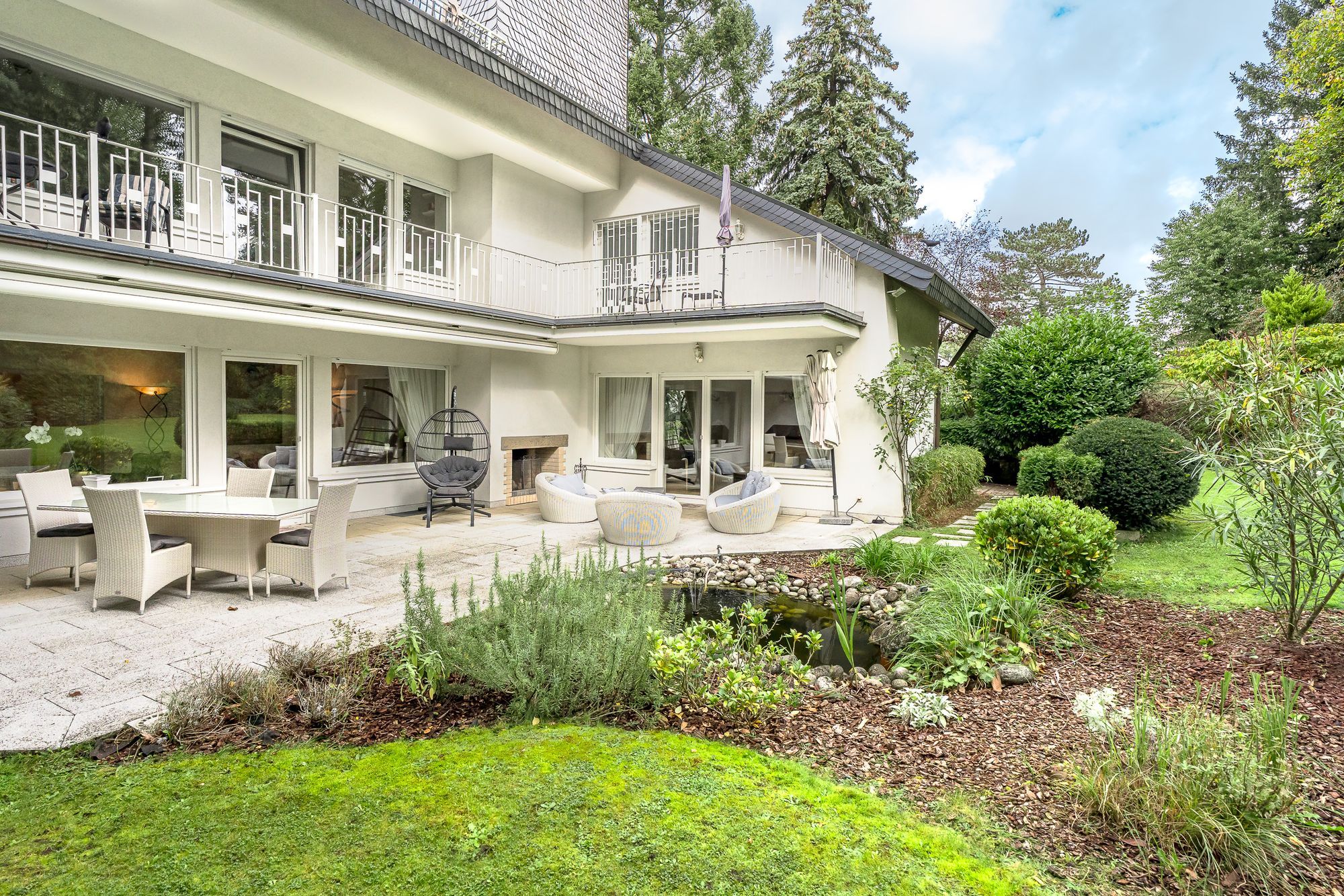 Über das geräumige Foyer (18,35qm)betritt man den Wohn-Essbereich mit Kaminzimmer (94,95qm) und Ausgang auf die mediterran
