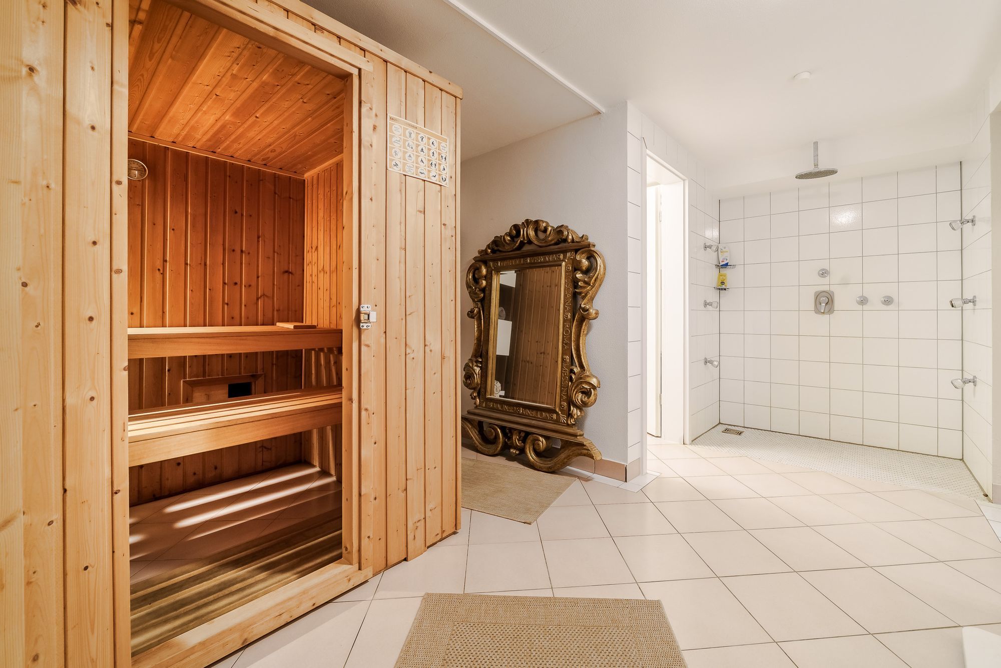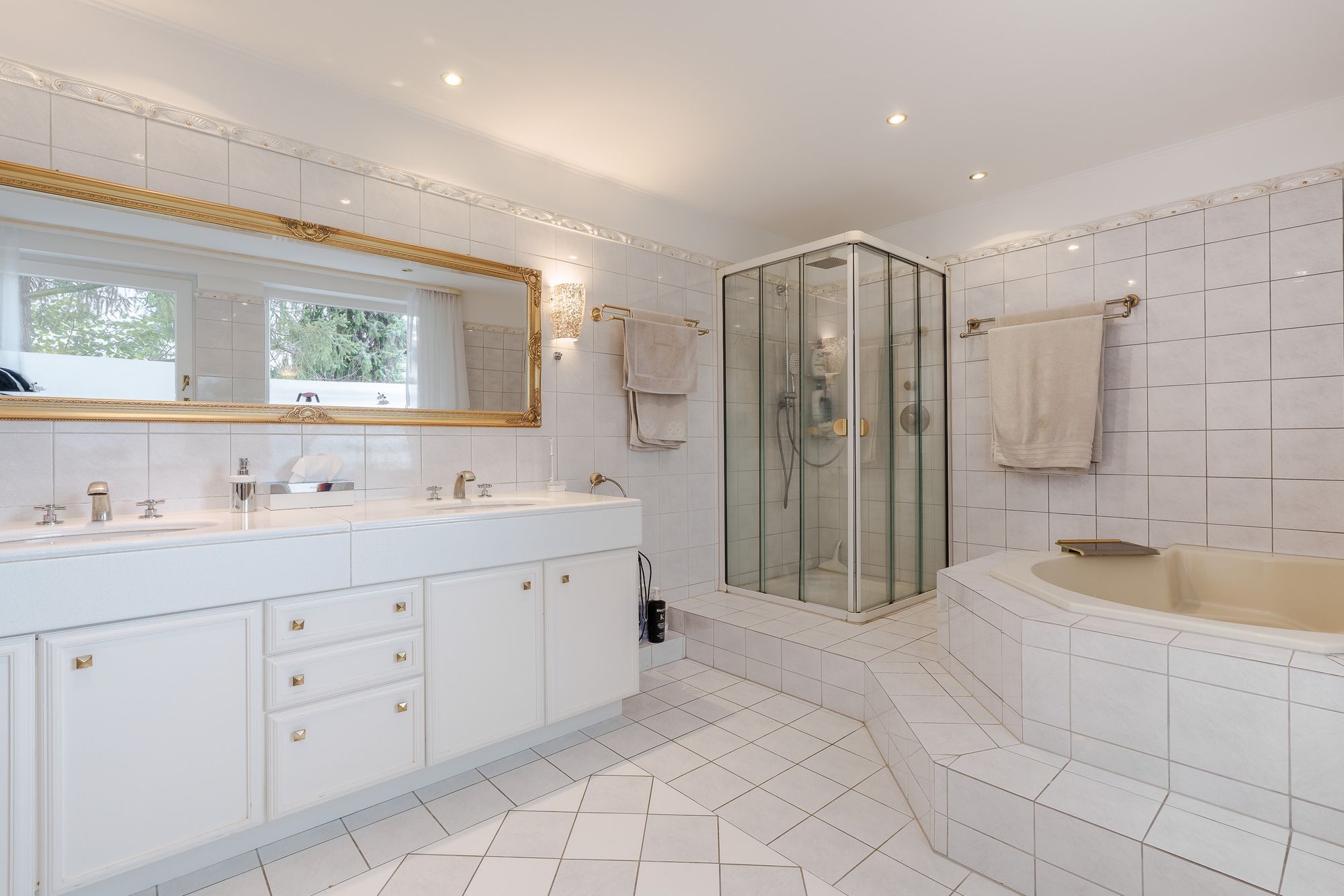 gestaltete Terrasse. Gegenüber dem Esszimmer befindet sich die große Küche (17,10qm) und dem angrenzenden kleinen Esszimmer für die Familie (21,15qm). Zusätzlich zum Haupteingang gibt es einen weiteren Eingang von der Doppelgarage über einen Flur von 8,2qm. Im 1. OG ist das Elternschlafzimmer (44,98qm) mit angrenzendem Bad (12,6qm) sowie weitere 4 Zimmer (15,84qm, 16,17qm, 18,02qm, 11,88qm) und 2 Bäder 5,76 und 4,25qm). Das Dachgeschoss hat weitere 4 Zimmer (31,92qm, 14,52qm, 19,08qm, 16,7qm) sowie 2 Bäder (jeweils 4,6qm). Wohnzimmer, Schlafzimmer und Kinderzimmer sind klimatisiert. Das Untergeschoss hat eine Sauna mit Ruheraum und Toilette/Dusche sowie einen großen Hobbyraum. Auch ist hier für viel Stauraum und einen Weinkeller gesorgt.