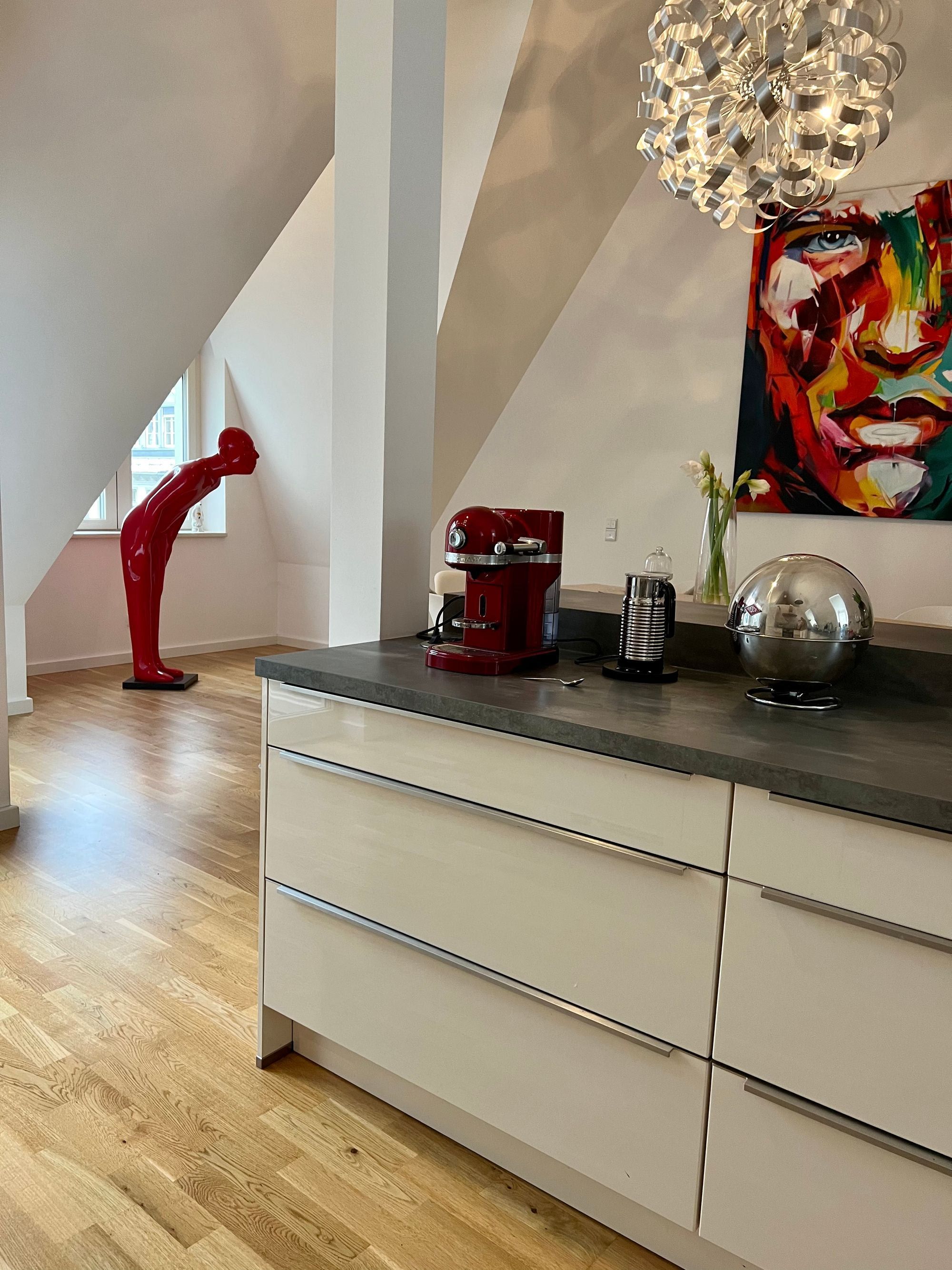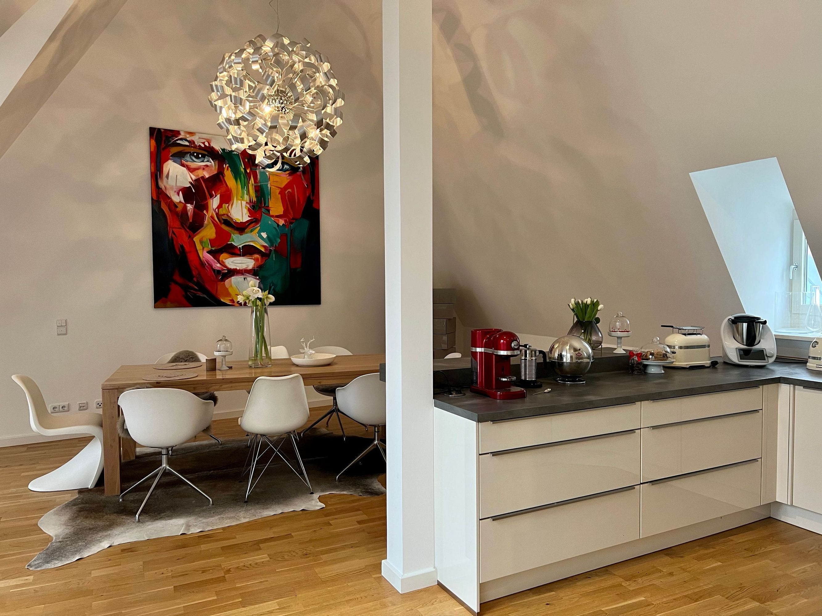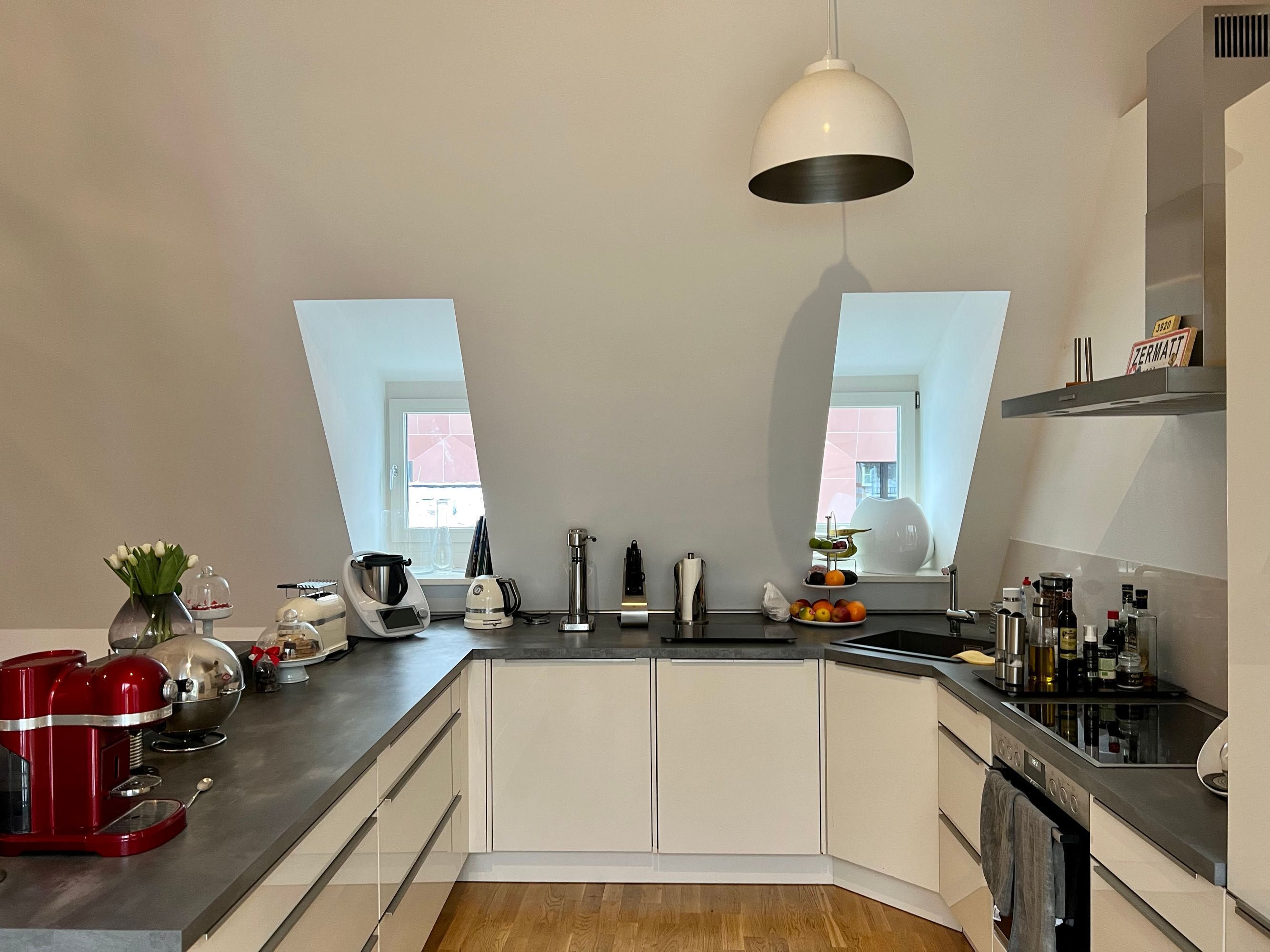 Die Immobilie überzeugt durch einen lichtdurchfluteten, großzügigen Grundriss sowie eine elegante Raumaufteilung. Der offen gestaltete Wohn- und Essbereich erstreckt sich über Eck und schafft durch seine architektonische Gliederung eine angenehme, natürliche Zonierung. Die hochwertige, zentral positionierte Einbauküche mit moderner Thekenlösung fügt sich harmonisch an den Essbereich an und bildet das kommunikative Herzstück der Wohnung.