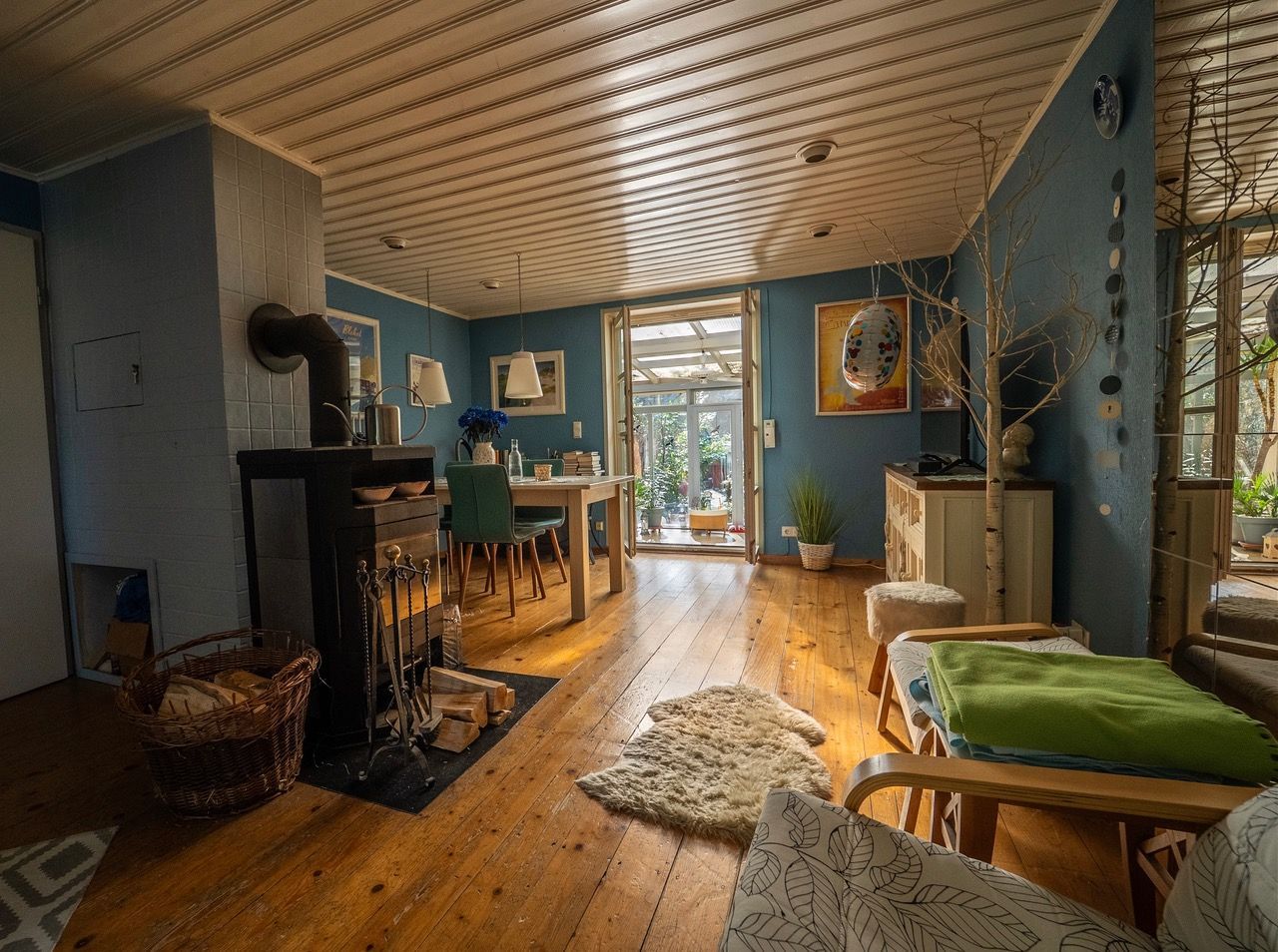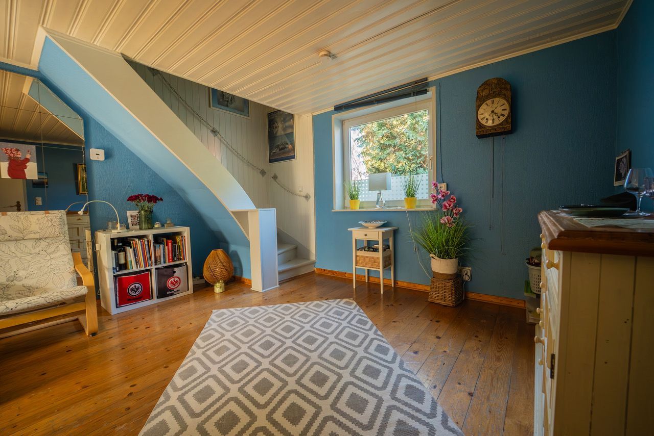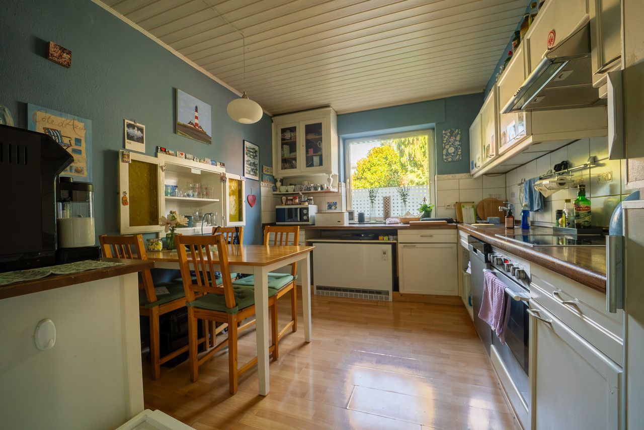 Der Wohnbereich bildet den Mittelpunkt des Hauses und bietet Platz für einen großzügigen Wohn- und Essbereich. Ein Kaminofen sorgt hier zusätzlich für eine warme und gemütliche Atmosphäre, besonders an kühleren Tagen. Direkt angrenzend befindet sich die funktional angeordnete Küche, die sich gut in den Alltag integrieren lässt.