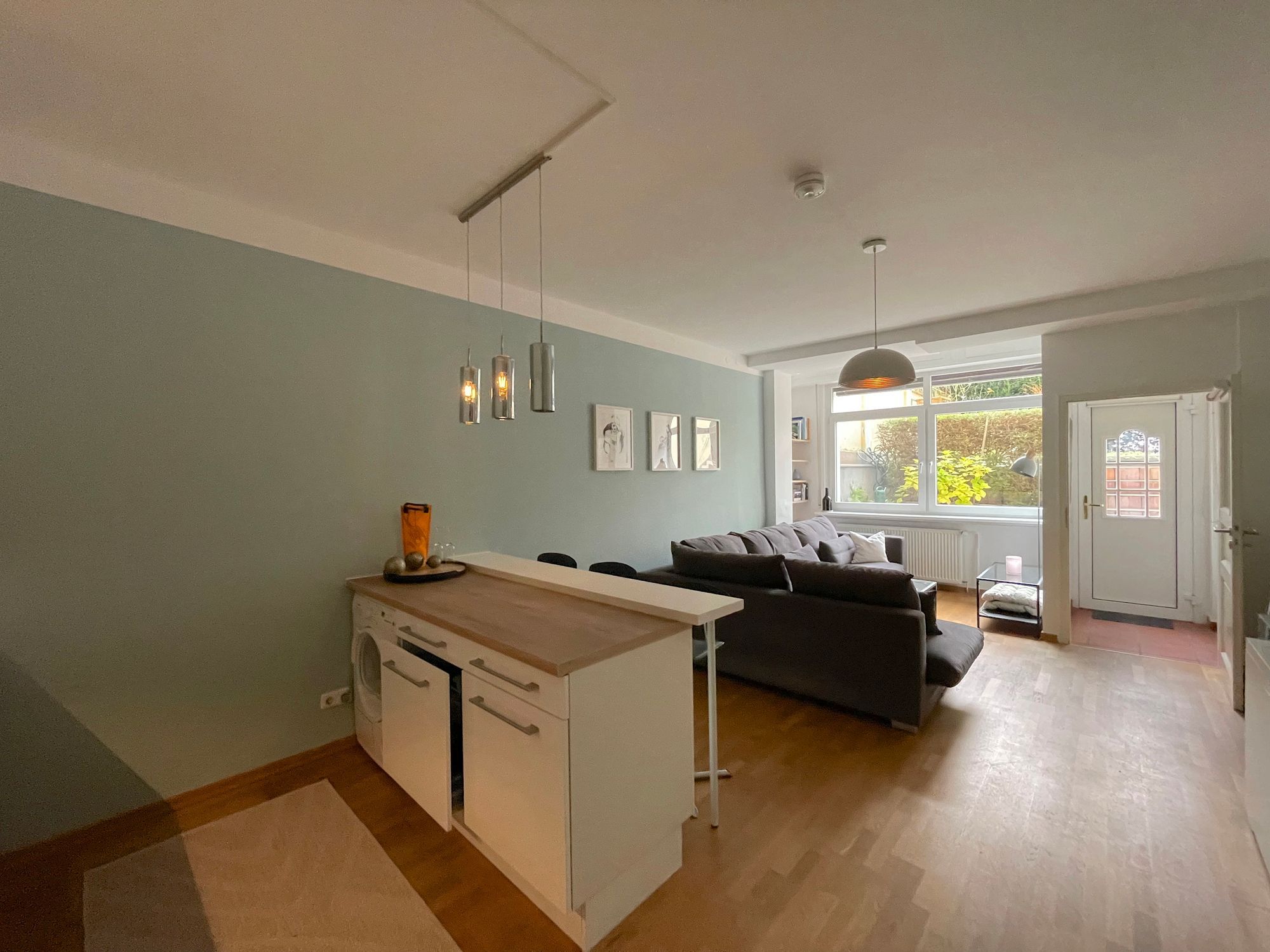 Das Wohnzimmer mit Blick in den Garten ist mit einer gemütlichen Couchecke ausgestattet und geht über eine Theke in die offen Küche über.