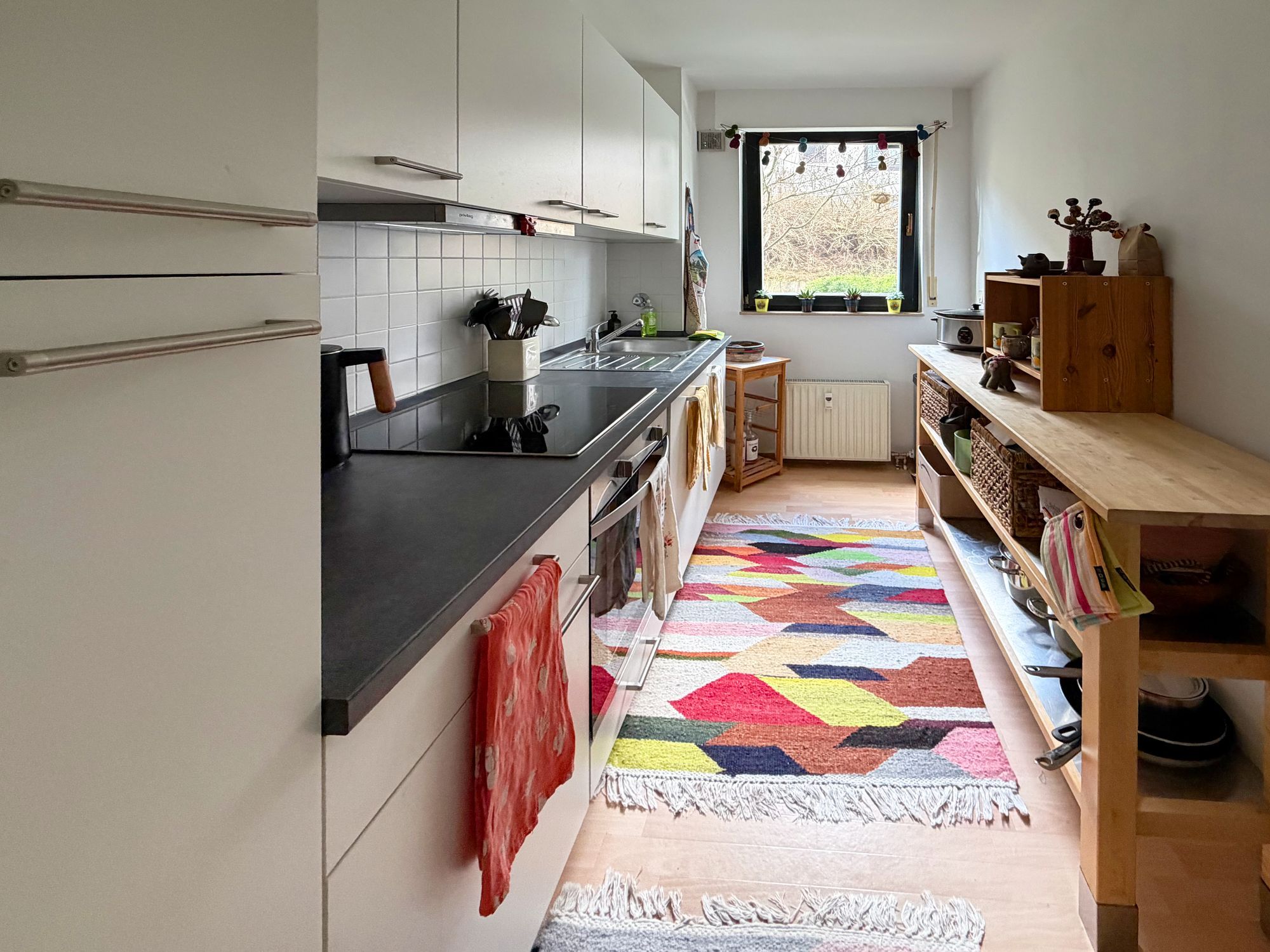 Vom Eingangsbereich aus sind sämtliche Räume bequem erreichbar. Der ca. 29,30 m² große Wohn- und Essbereich bildet den zentralen Mittelpunkt der Wohnung und wirkt durch die großen Fensterflächen angenehm hell. Von hier aus gelangen Sie direkt auf die Terrasse mit zugeordnetem Gartenbereich zur alleinigen Nutzung. In unmittelbarer Nähe hierzu befindet sich die separate Küche, die funktional angeordnet ist und über ein eigenes Fenster verfügt.