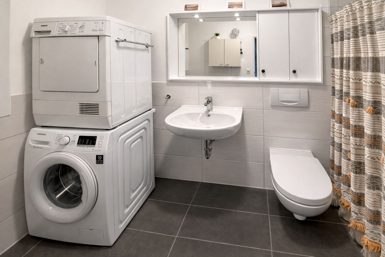 Auch der ruhig gelegene Schlafbereich bietet ausreichend Platz für ein großzügiges Bett sowie einen Kleiderschrank und fügt sich stimmig in die Raumaufteilung ein. Das helle Badezimmer ist mit einer bodengleichen Dusche ausgestattet und bietet zudem Anschlüsse sowie Stellmöglichkeiten für Waschmaschine und Trockner.